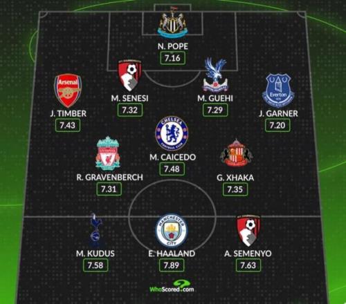 WhoScored列出本赛季英超开赛至今的最佳阵容,哈兰德、凯塞多、扎卡、廷伯在列。